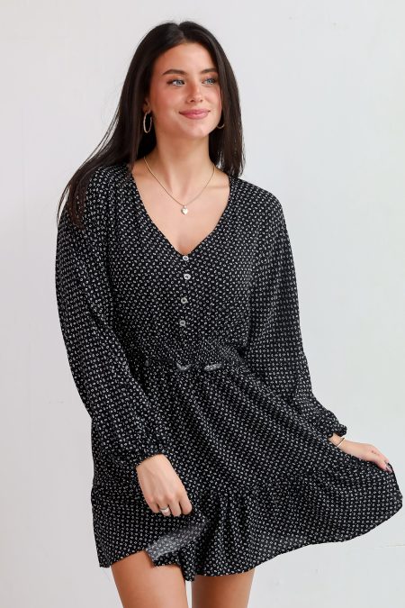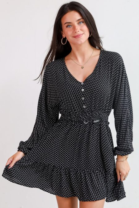 $231.00Heads will turn wherever you go wearing the Desirably Dramatic Black Mini Dress! This sleek and stylish mini dress features a striking geometric pattern that adds a modern edge to a classic silhouette. The long sleeves provide a touch of sophistication, making it perfect for transitioning from day to night.…
